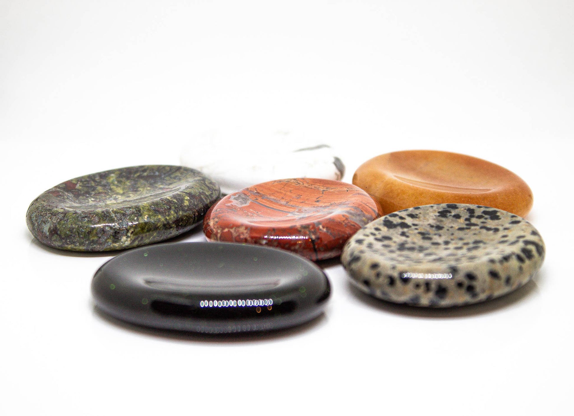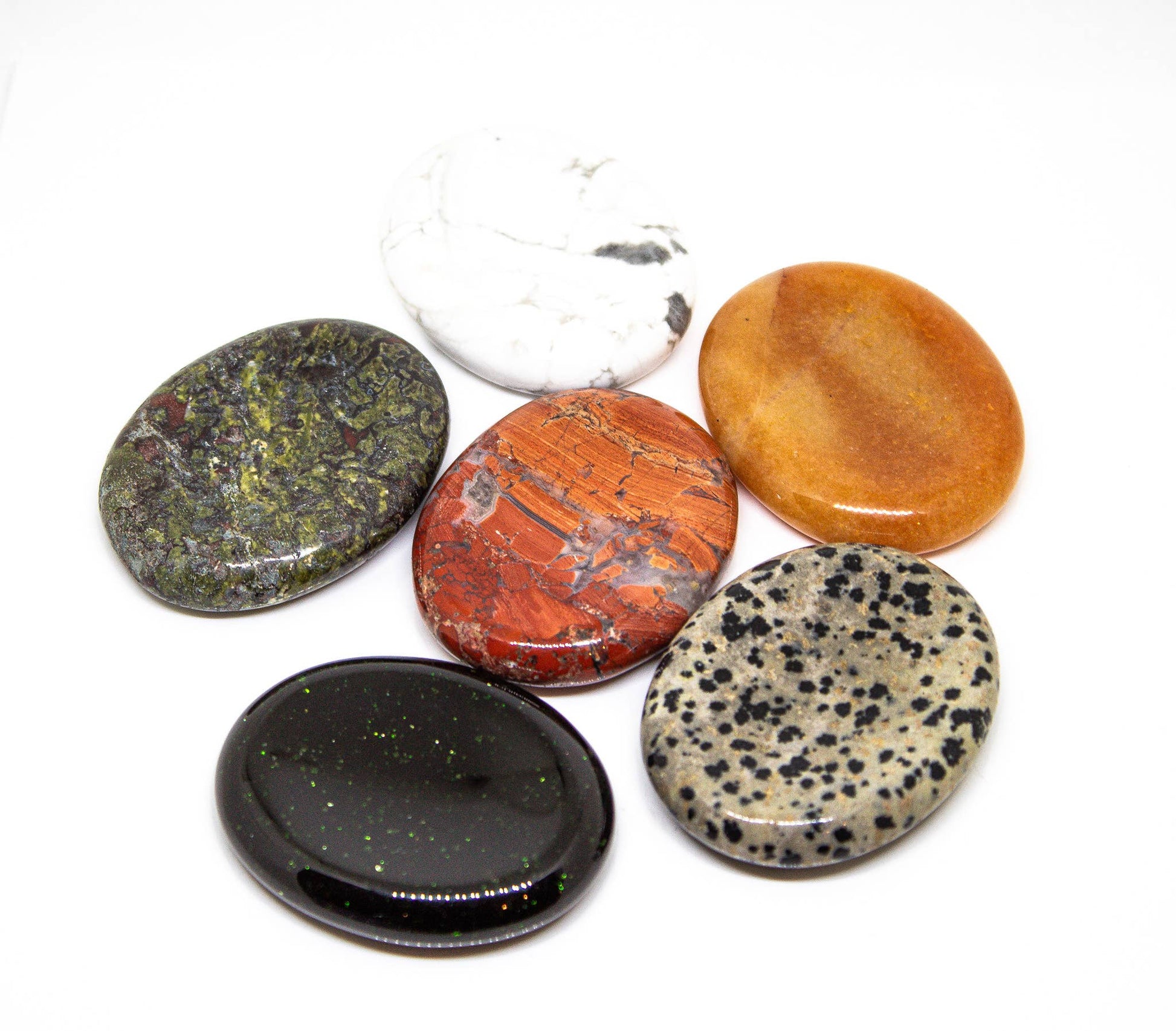 Natural Polished Gemstone Worry Gemstones:- Opalite, Strawberry Quartz, Unakite, Sodalite, Tigereye, Dalmation Jasper, Gold Stone, Petwood, Red Aventurine, etc Dimensions: 50x40x10mm