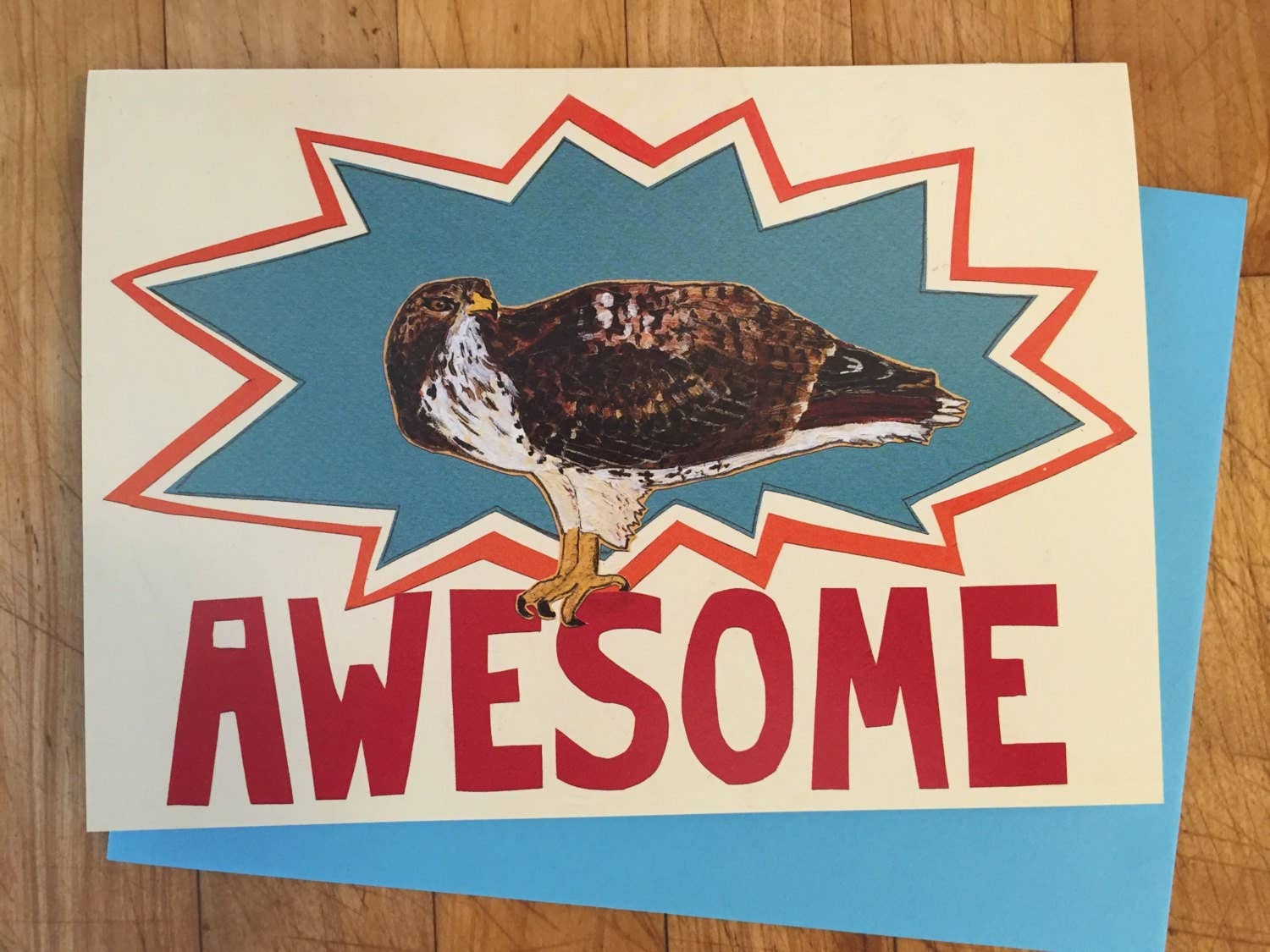 Blank awesome hawk card that comes sleeved with a colorful envelope. Image is handmade collage, scanned, then printed on a lithograph (offset) printer on high quality card stock.