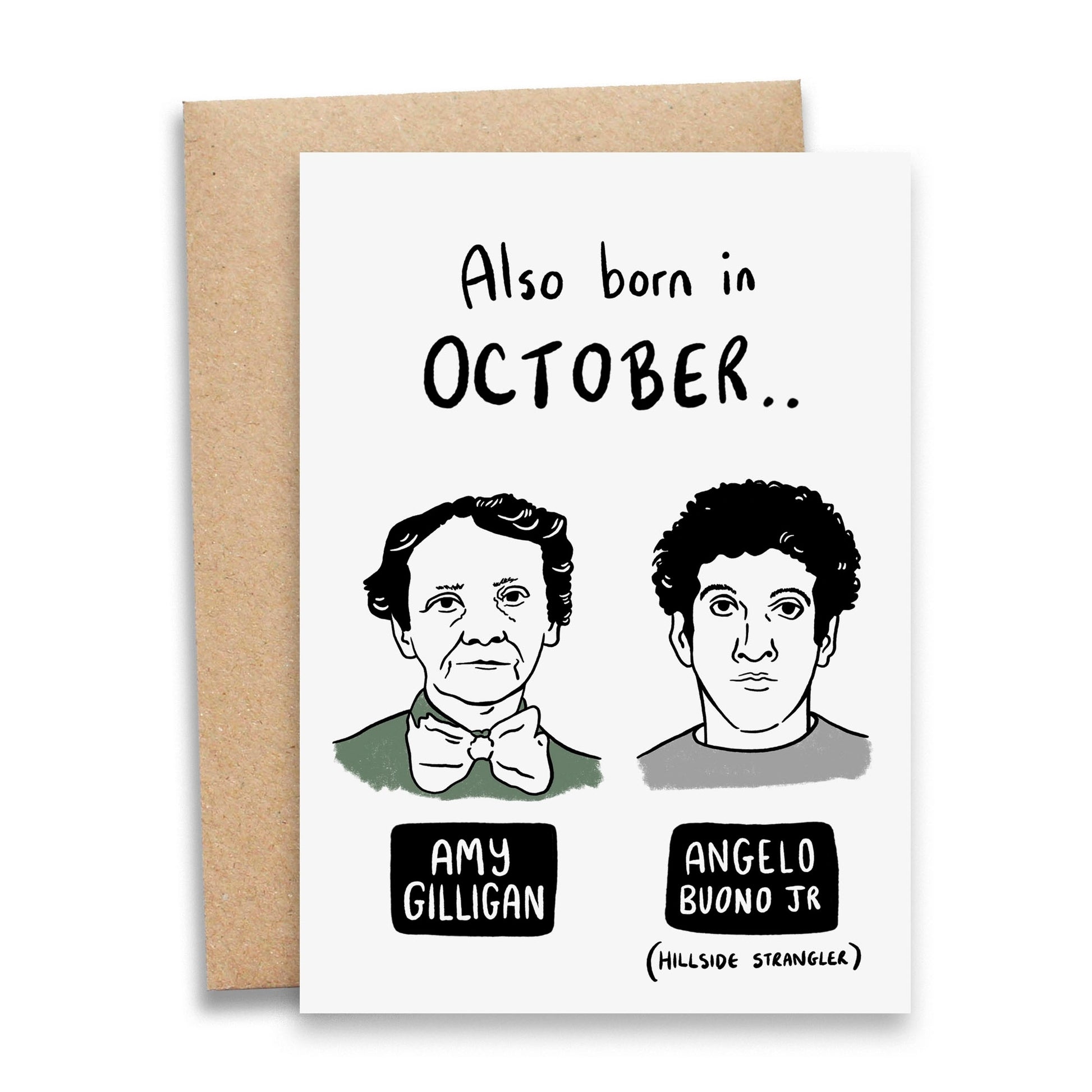A serial killer themed birthday card for all those true crime fans born in October, featuring Amy Gilligan and Angelo Buono Jr.